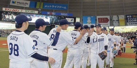 本拠地開幕11連勝を飾り、タッチを交わす西武ナイン=メットライフドーム【写真提供:共同通信社】西武は同点で迎えた5回裏、…