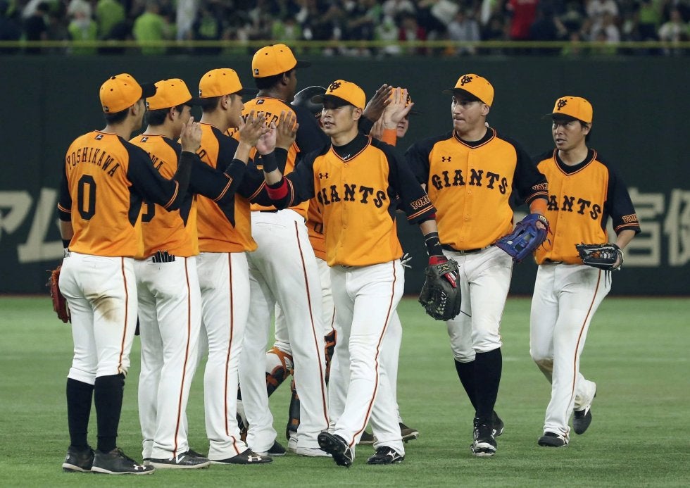 ヤクルトに勝利して7連勝とし、タッチを交わす巨人ナイン=東京ドーム【写真提供:共同通信社】