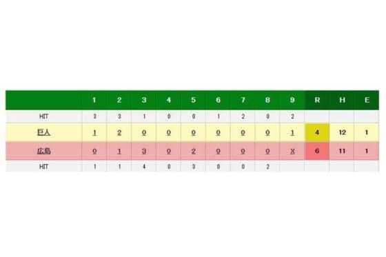 広島は5回。1死一塁から会沢が左翼線へタイムリー二塁打を放ち追加点を奪うと、2死一、三塁から菊池の右前タイムリーで6点目を奪った。巨人は9回2死二塁から代打・阿部が右前タイムリーを放ち1点を返したがここまで。