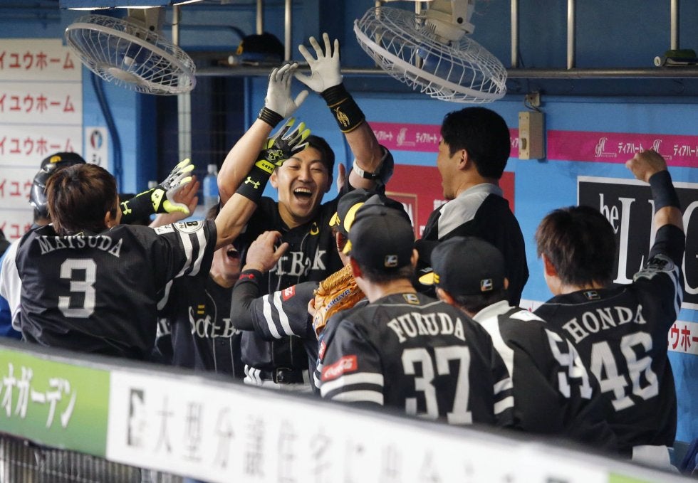 4回、本塁打を放ち、ベンチで祝福されるソフトバンク・内川=ZOZOマリン【写真提供:共同通信社】