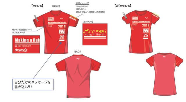 Tシャツは、自分でメッセージを書いてオリジナルTシャツを作ることができるデザインを採用。前身頃左側にプリントされた開催日のグラフィック下部に作られた白色箇所に、自分の目標を書きこんだり、サポーターからのメッセージを書き込んでもらうことができる。