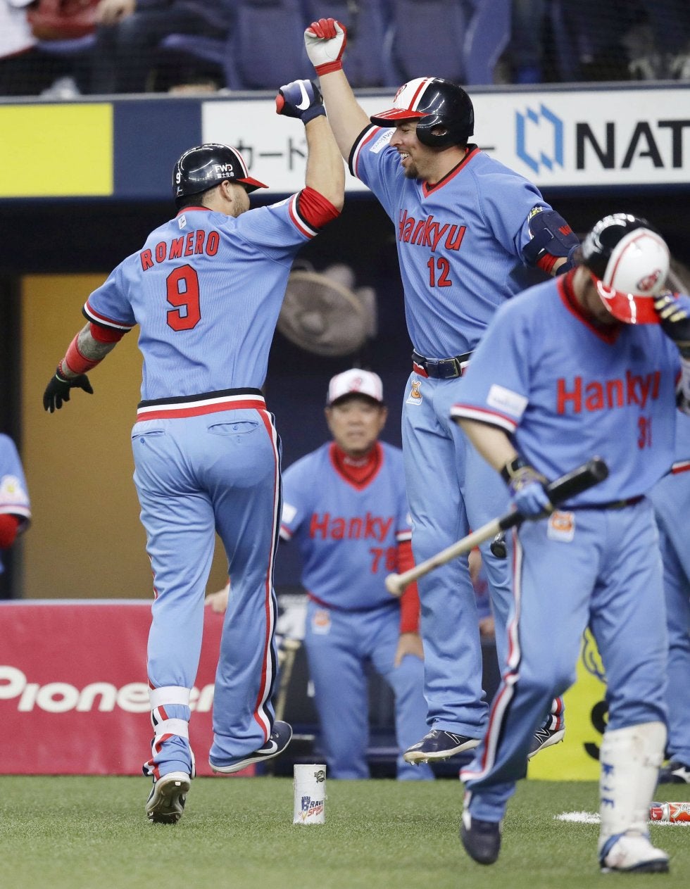 7回、勝ち越し本塁打を放ったロメロ(9)を迎えるオリックスのマレーロ=京セラドーム【写真提供:共同通信社】