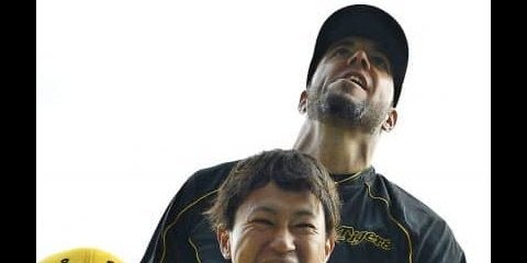 DeNAに勝利し笑顔の阪神・上本(手前)とメッセンジャー=甲子園【写真提供:共同通信社】阪神の上本博紀が3日の横浜DeN…