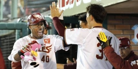 4回、先制ソロを放ち嶋(右)と笑顔でタッチする楽天・ウィーラー=楽天生命パーク宮城【写真提供:共同通信社】楽天が連敗を4…