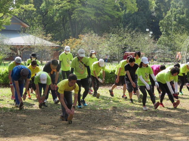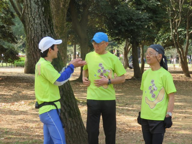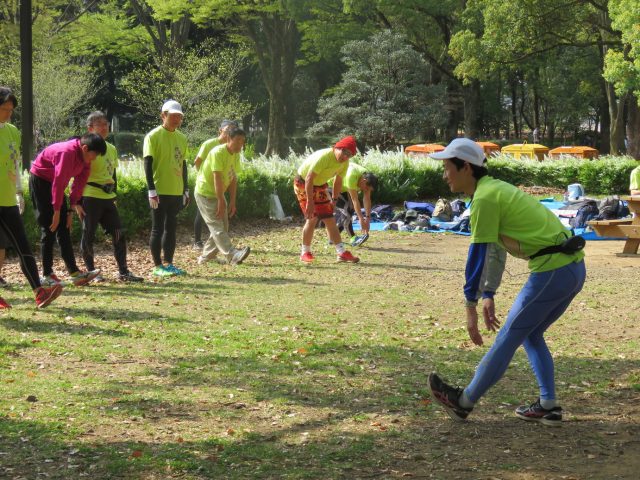 朝9時にスタートすると、まず全員で体操やストレッチを行い、ゆっくりと1㎞ほど歩きます。身体を温めたところで、今度は明石さん主導で各種ドリルを行っていきます。