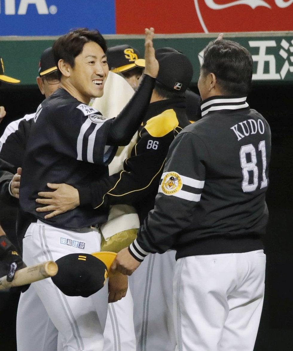8回、通算2千安打を達成し、工藤監督(右)とタッチするソフトバンク・内川=メットライフドーム【写真提供:共同通信社】ソフ…