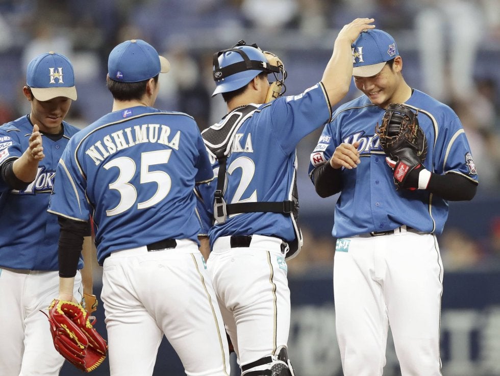オリックス戦に勝利し、笑顔の日本ハム・清宮(右端)とナイン=京セラドーム【写真提供:共同通信社】日本ハムは2回表、清宮の…
