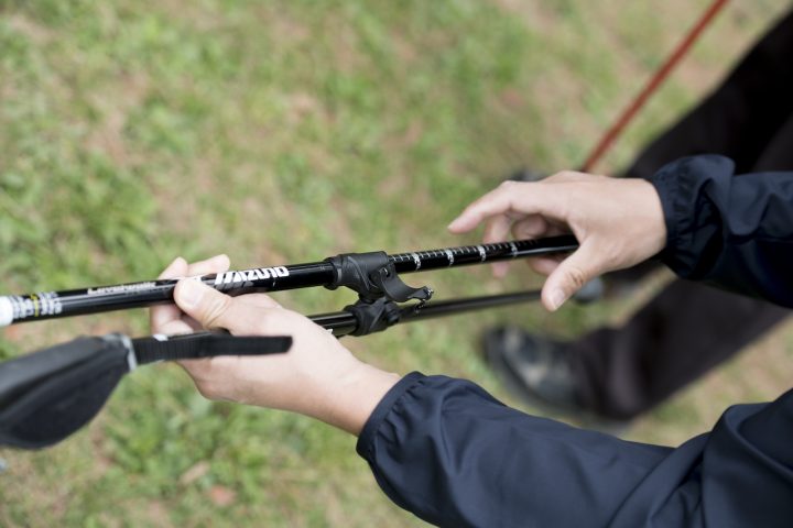 また、ポールの長さを自分の背丈に合ったものにすることも重要。長さが合っていないと、歩くときの姿勢が猫背になったり、背を反らすようになってしまうからです。今回使ったミズノ製のポールには、“この身長ならこの長さでOK”を示すメモリがついていたので調整は簡単でした。