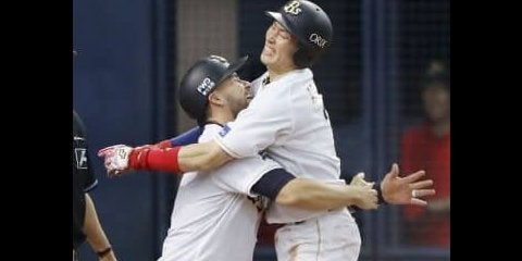12回、サヨナラの生還を果たし、ロメロ(左)と抱き合って喜ぶオリックス・安達=京セラドーム【写真提供:共同通信社】オリッ…