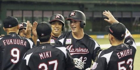 西武戦の2回、ロッテのドミンゲス(右から2人目)が逆転3ランを放ち、ナインに迎えられる=メットライフドーム【写真提供:共…