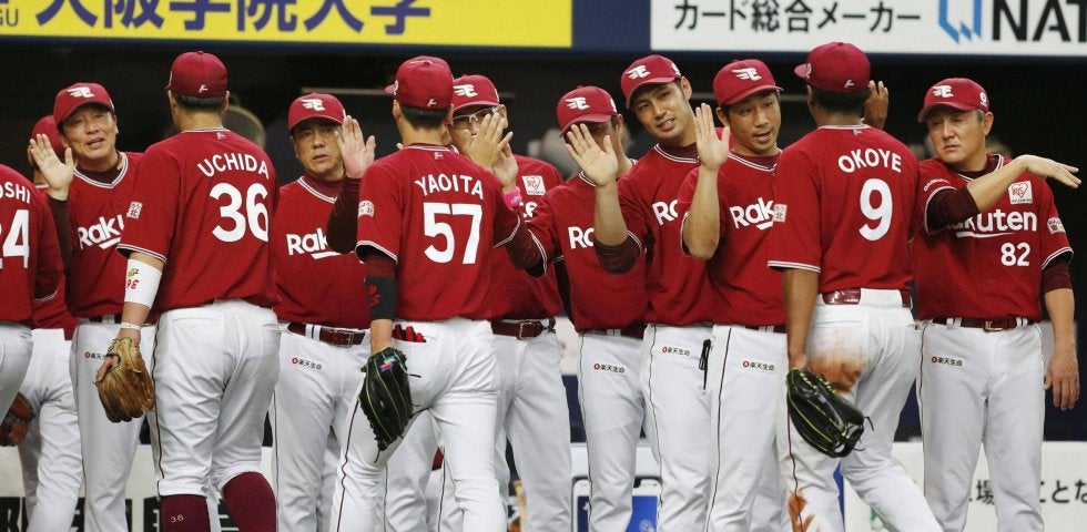 オリックスに快勝し、喜ぶ楽天ナイン=京セラドーム【写真提供:共同通信社】