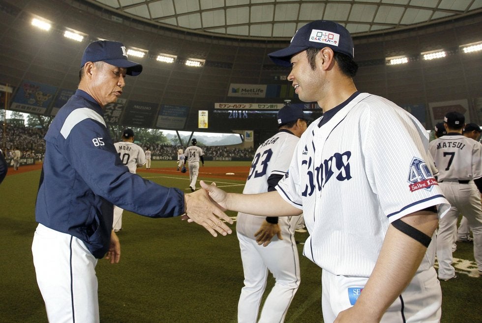 4勝目を挙げ、辻監督(左)と握手する西武・榎田=メットライフドーム【写真提供:共同通信社】