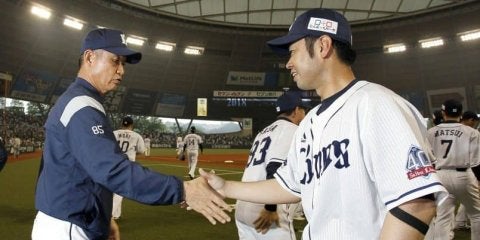 4勝目を挙げ、辻監督(左)と握手する西武・榎田=メットライフドーム【写真提供:共同通信社】西武は初回、外崎と木村の適時打…