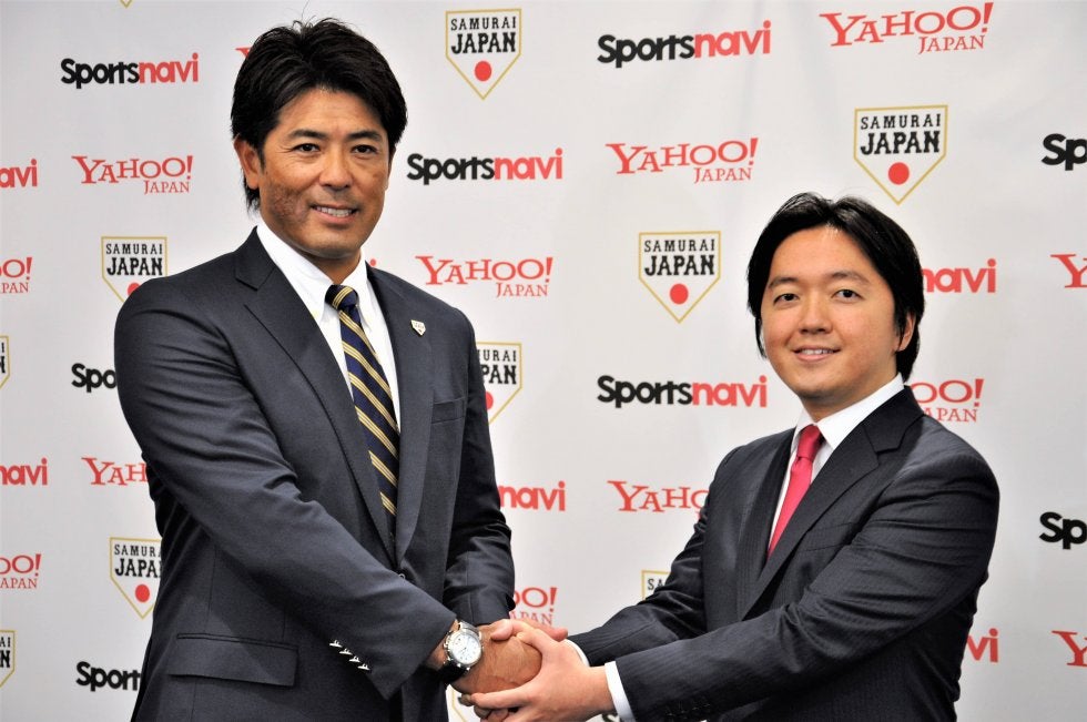 侍ジャパンでの野球振興を誓う侍ジャパン稲葉監督(左)とヤフー株式会社常務執行役員メディアカンパニー長・宮澤弦氏