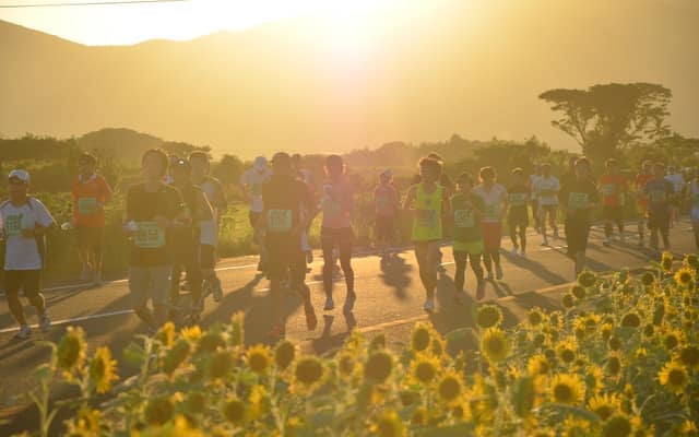 「五島列島夕やけマラソン大会」は、日本列島で最後に沈む夕陽を背に走ることができる大会だ。沿道で島人がスイカや梅干しを配ったり、応援してくれるだけでなく、ゴールで五島牛、五島美豚など島の味を楽しめる。