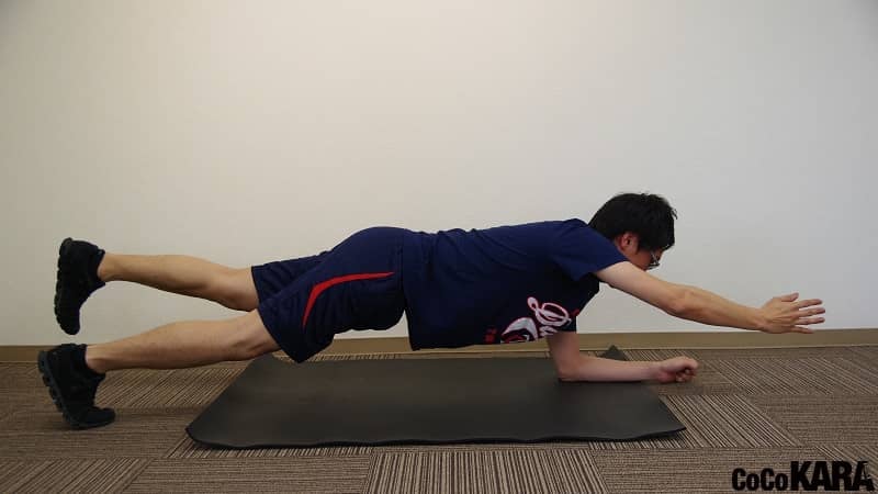 つま先と肘を支点にし、お尻が落ちないようにキープしましょう。プランクの状態が作れたら、片手をまっすぐ前へと伸ばし、手と対になる足を上げます。
