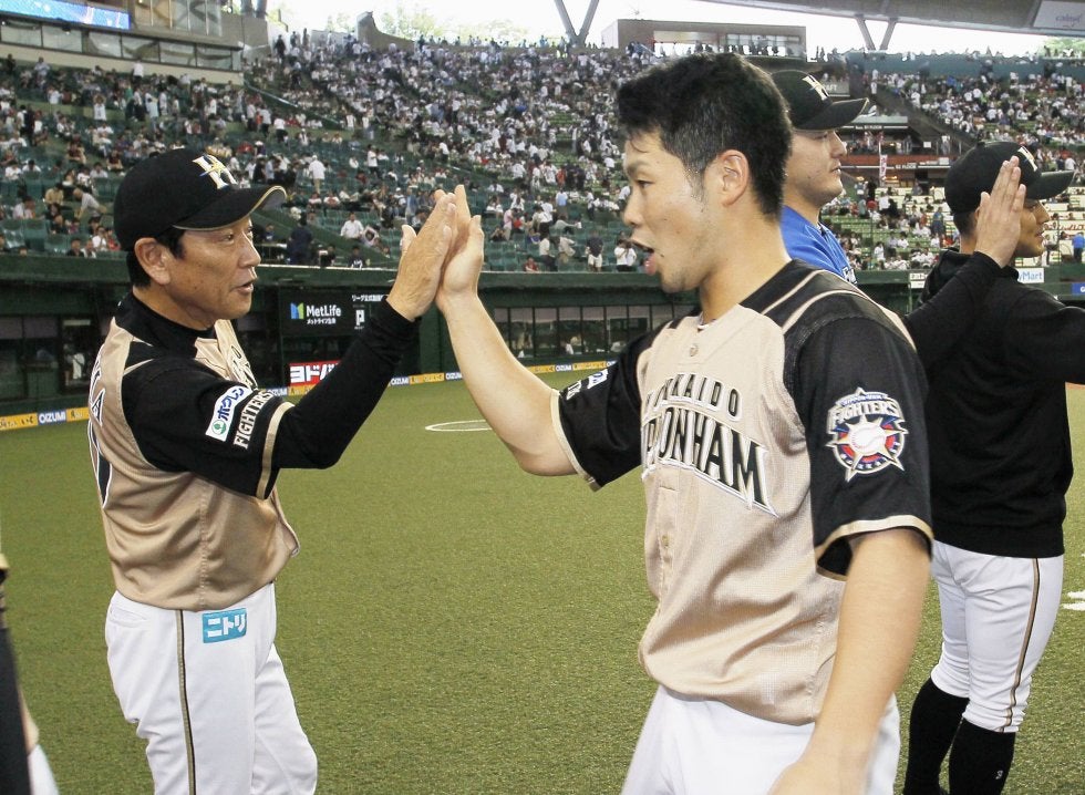 西武に3連勝し、近藤(右)とタッチを交わす日本ハム・栗山監督=メットライフドーム【写真提供:共同通信社】 北海道日本ハム…