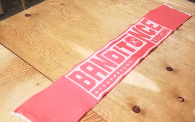 バンディオンセ加古川のロゴは、一般的なプリント柄とは違い、先に色染めした糸で模様を織り出して表現。特別な仕上がりになっている。カラーはバンディレッド2018、バンディホワイト2018の2色。サイズは幅約17cm×長さ約120cm。価格2,500円(税込)。