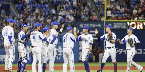楽天に勝利し、タッチを交わすDeNAナイン=横浜【写真提供:共同通信社】 横浜DeNAの髙城俊人が、29日の対東北楽天戦…