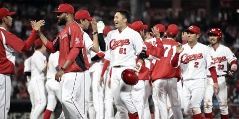広島―西武2 10回、西武にサヨナラ勝ちし、喜ぶ鈴木(中央)ら広島ナイン=マツダ【写真提供:共同通信社】 広島東洋の堂…
