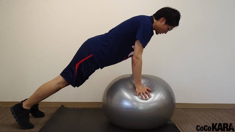 足はつま先立ちにし、バランスボールに手を載せる。お尻が落ちて背中が反らないよう注意しましょう。手を置く場所は左右ズレないように肘は少し曲げたほうがバランスを取りやすい。そのままキープ。バランスボールは不安定なので転ばないように気をつけます。だんだん疲れてきても、骨盤や腕を落とさないように。