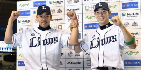 阪神に勝利し、お立ち台でポーズをとる西武の菊池(左)と秋山=メットライフドーム【写真提供:共同通信社】 埼玉西武の菊池雄…