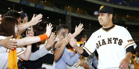 2年ぶりの勝利を挙げ、ファンとタッチを交わす巨人・今村=東京ドーム【写真提供:共同通信社】 読売巨人のプロ7年目・今村信…