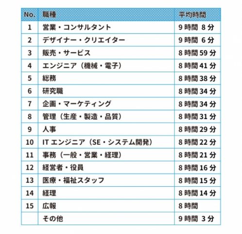 勤務時間ランキングにおいて、トップ3の職種は「営業・コンサルタント」「デザイナー・クリエイター」 「販売・サービス」という結果になりました。「営業・コンサルタント」や「販売・サービス」など、移動や立ち仕事が多い職種も上位となっています。また、どの職種も8時間以上で、全体の平均勤務時間は8時間29分となりました。