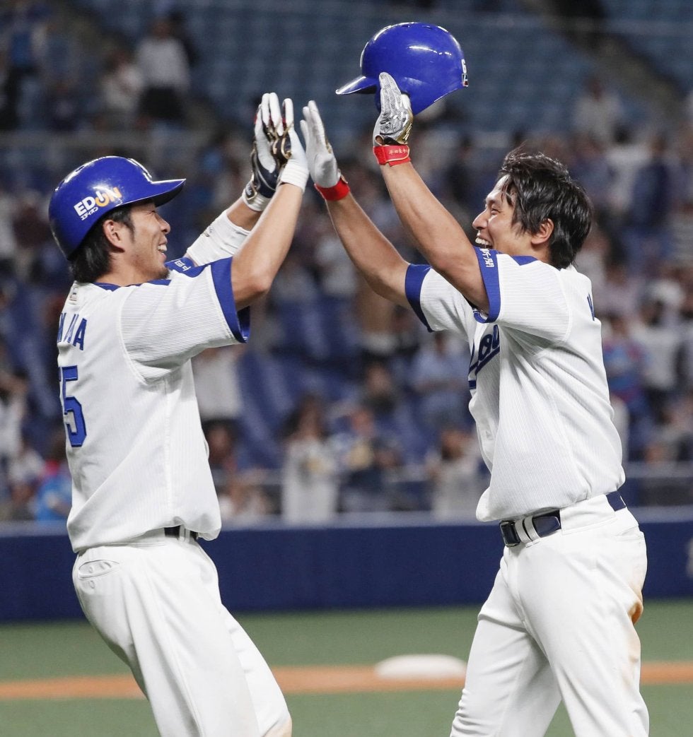 ロッテにサヨナラ勝ちし、喜ぶ中日・平田(右)と福田=ナゴヤドーム【写真提供:共同通信社】