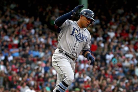 レイズのカルロス・ゴメスは同僚と交錯しながらもボールを離さなかった
