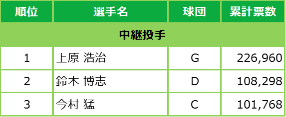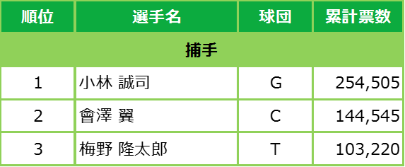 セ・リーグ、外野手部門では広島東洋・鈴木が2位に食い込んできた。さらには同球団の丸も上位に。