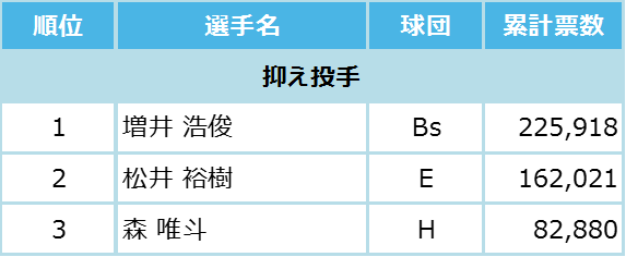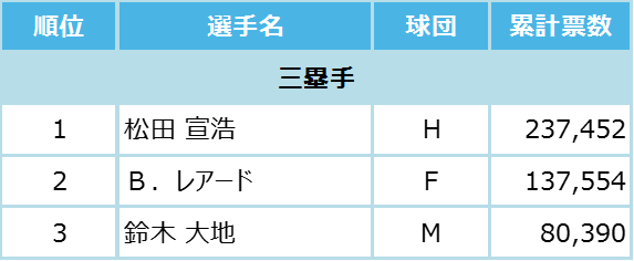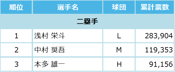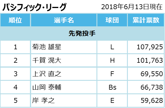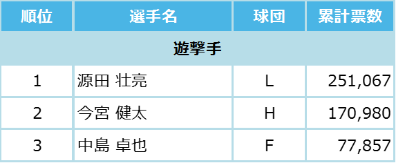 パ・リーグでも外野手部門で福岡ソフトバンク・中村を抜き北海道日本ハム・西川が5位にランクイン。