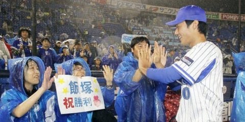 今季初勝利を挙げ、ファンとタッチを交わすDeNA・飯塚=横浜【写真提供:共同通信社】 横浜DeNAの飯塚悟史が18日の埼…