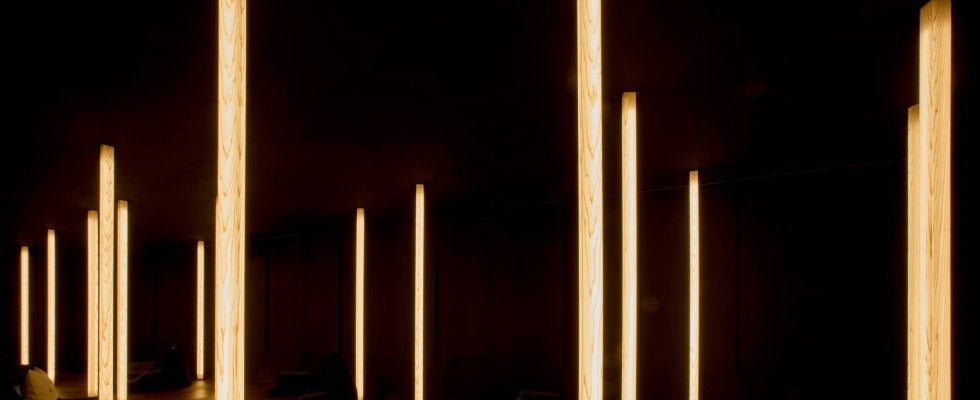 瞑想状態に入る準備を整えてスタジオに向かうと、暗闇の中に複数の柱が光り立ち、禅のミニマリズムとシンプリシティを意識した空間が広がっています。柱と向き合う瞑想専用クッションに座ると、音声ガイダンスとともに柱が発光し、参加者を瞑想に誘います。