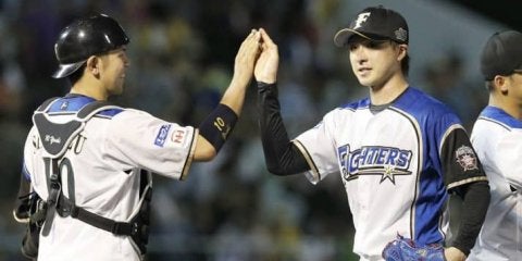 ソフトバンクに完封勝利し、捕手清水(左)とタッチする日本ハム・上沢=沖縄セルラー【写真提供:共同通信社】 北海道日本ハム…