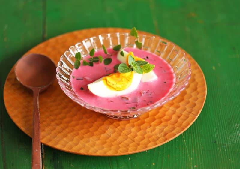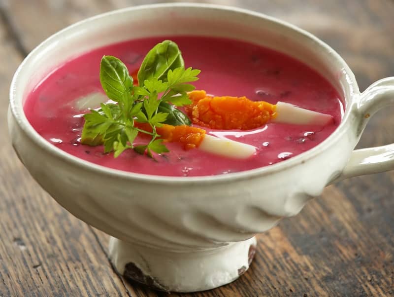 ポーランドの夏の短い期間にだけにいただく、ピンクや赤、紫色が鮮やかな、視覚を刺激する冷製スープです。「飲む輸血」と呼ばれるほど栄養価の高いビーツなどの野菜を煮出して冷やしたものに、ヨーグルトやサワークリームなどの乳製品を入れ、ゆで卵やきゅうり、ラディッシュ、ハーブ類などを混ぜて仕上げたもの。シーズンに入ると、現地では出来合いの市販品も数多く販売されているとか。
