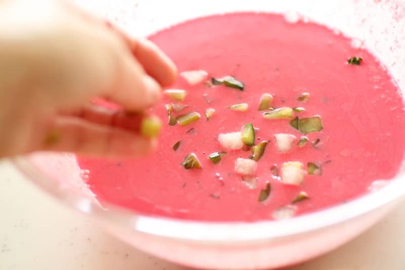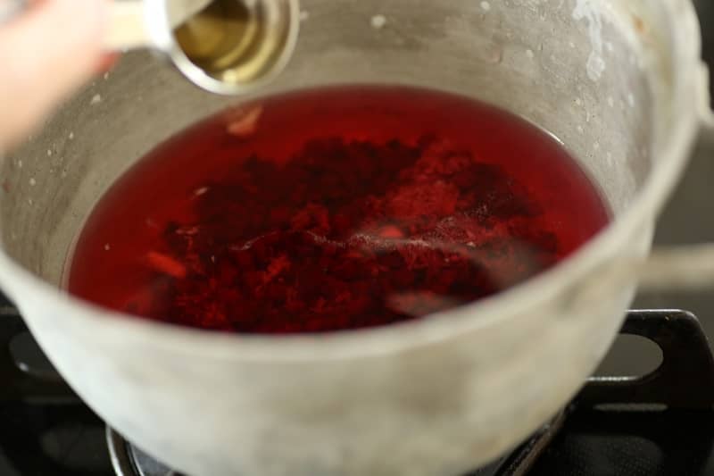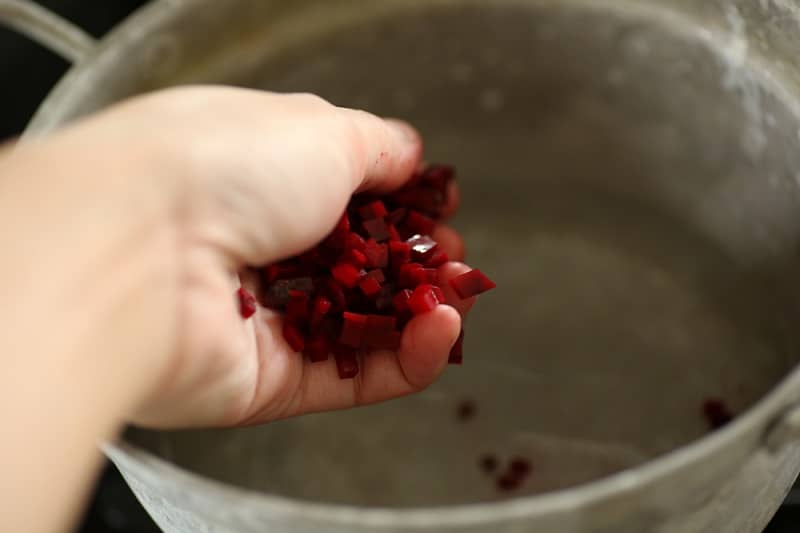 (1) 鍋に、水、皮ごと細かく刻んだビーツ(皮ごと摂取するのはポリフェノールを生かすため。栄養を逃さないように、実もスープも全ていただきます。早く仕上げるため、細かく刻んでいます)黒酢、ひとつまみの塩、にんにくのすりおろしを入れて火にかけ、ビーツに火が入るまでコトコト煮込んで火を止める。(10〜15分程度)これを冷蔵庫などでしっかり冷ましておく。