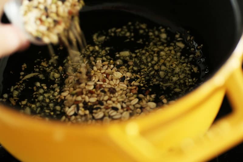 (3) (1)に水、トマト缶、月桂樹(ローリエ)、お好きなハーブ類(今回はフレッシュバジルとオレガノを1〜2本)を入れ、雑穀が柔らかくなるまでじっくりコトコト弱火で煮込み、仕上げにお好きなスパイス類(今回はナツメグ、クミン、パプリカ)を少々入れ、塩で味を整える。(この時もっとさらっとしたテクスチャーがお好みであれば、水を足して調整してあげると◎)