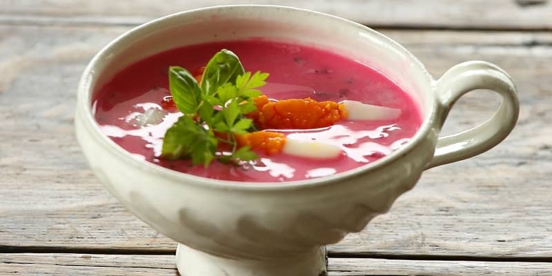 ポーランドの夏の短い期間にだけにいただく、ピンクや赤、紫色が鮮やかな、視覚を刺激する冷製スープです。「飲む輸血」と呼ばれるほど栄養価の高いビーツなどの野菜を煮出して冷やしたものに、ヨーグルトやサワークリームなどの乳製品を入れ、ゆで卵やきゅうり、ラディッシュ、ハーブ類などを混ぜて仕上げたもの。シーズンに入ると、現地では出来合いの市販品も数多く販売されているとか。