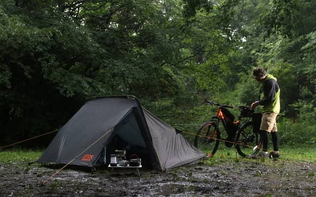 ポールをフライシートに通し、端から順にペグダウンしていくだけでテントが立ち上がる。基本形は結露が起こりにくいダブルウォール構造で、多雨・多湿な日本の気候に対応。フライシートのみでの設営できる。ポールの代わりに、逆さに置いた自転車で設営することも可能だ。