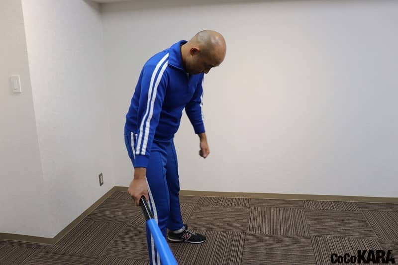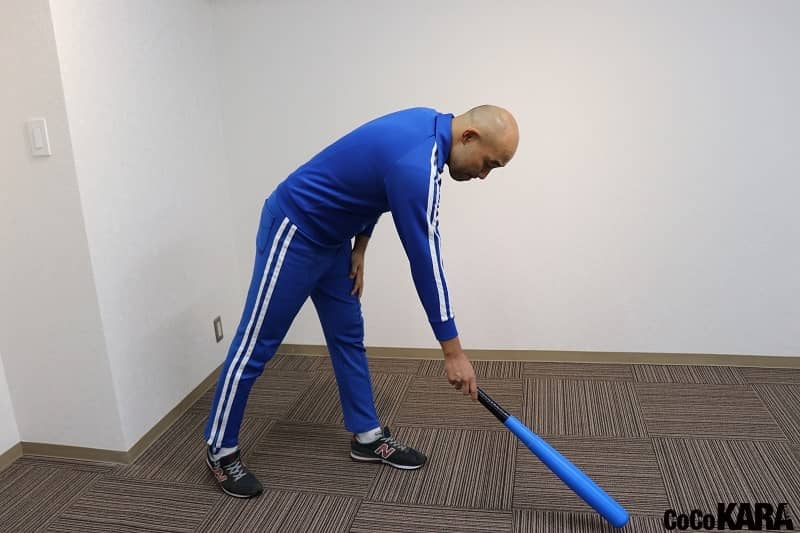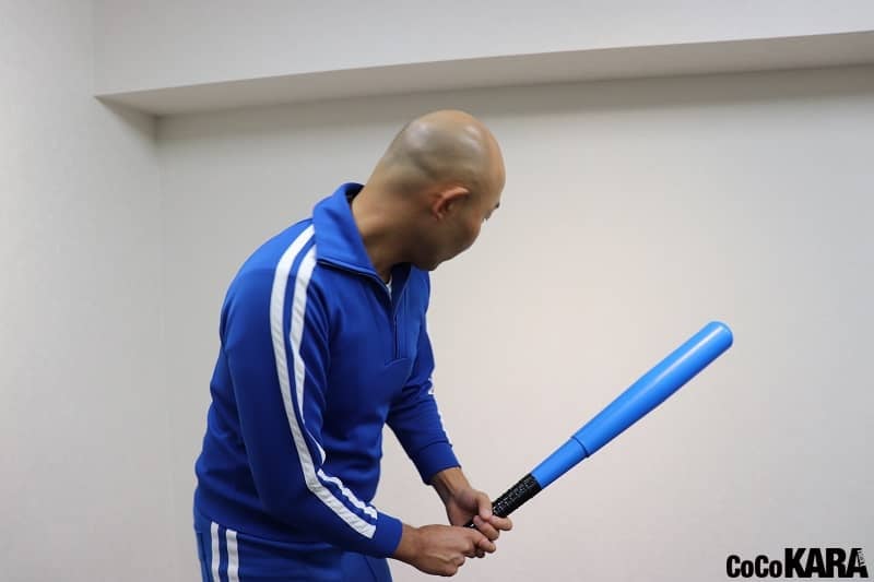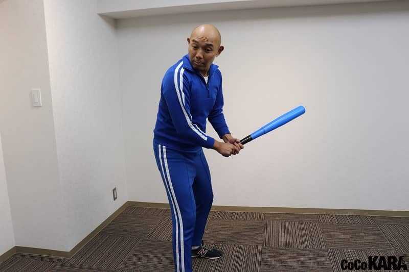構える前に投球されてしまったアップショーのものまねは、首のエクササイズになります。