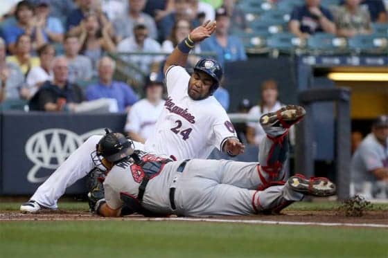 ホームでタッチアウトになったブルワーズのアギラル【写真:Getty Images】