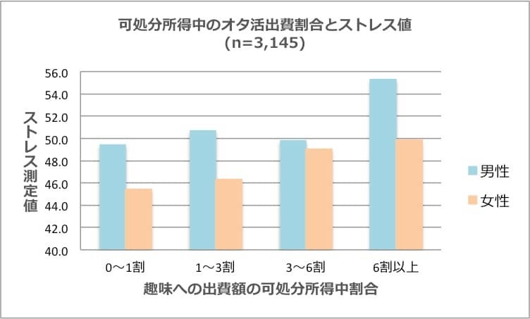 可処分所得のうち趣味に費やす金額の割合についての質問に対して、6割以上を趣味のための出費にあてると回答した人達は、男女ともに回答者全体(3,145人)の平均値よりも10%近くストレス指数が高くなりました。