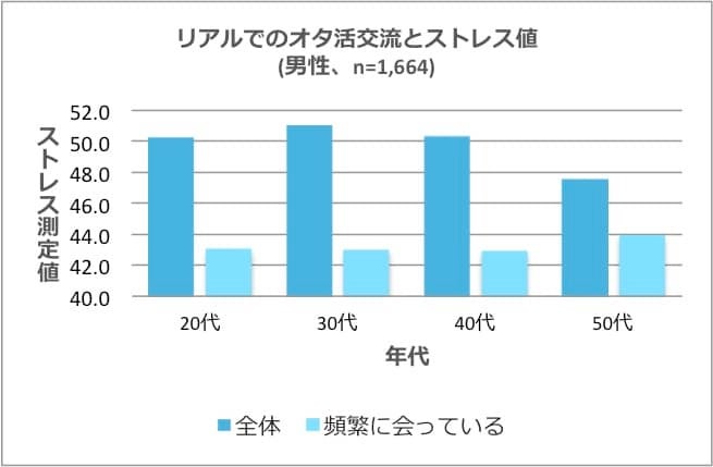 今回のアンケートでは、「同じ趣味をもつ人たちとネット以外でも交流していますか?」という質問に対し「頻繁に会っている」と答えた20代、30代、40代男性が、同年代の男性回答者の平均値よりも15%以上低いストレス指数を出しました。