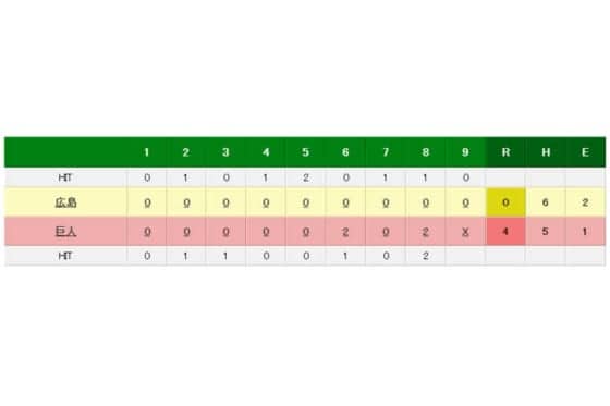 菅野は5回2死一、二塁のピンチで田中を二飛に打ち取ると、西川に三塁打を許して招いた7回無死三塁も後続を打ち取り、度重なるピンチをことごとく脱出。8回6安打無失点、2桁10三振を奪う力投で9勝目をマーク。チームは広島戦11試合目で3勝目を挙げた。