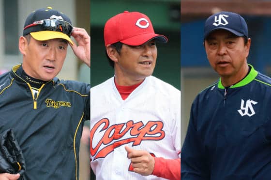阪神・金本監督、広島・緒方監督、ヤクルト・小川監督(左から)【写真:荒川祐史】