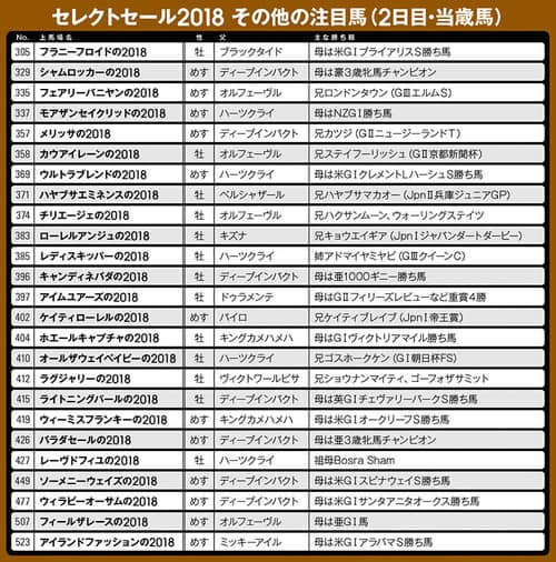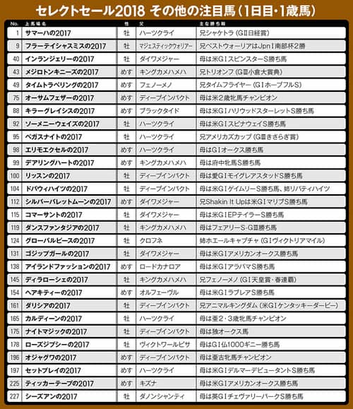以上、2日間の注目馬を紹介したが、ほかにも多くの良血馬が控えているため、それらは文末の一覧表にまとめた。この中から最高額落札馬が出てくる可能性もあるため、大いに注目いただきたい。
