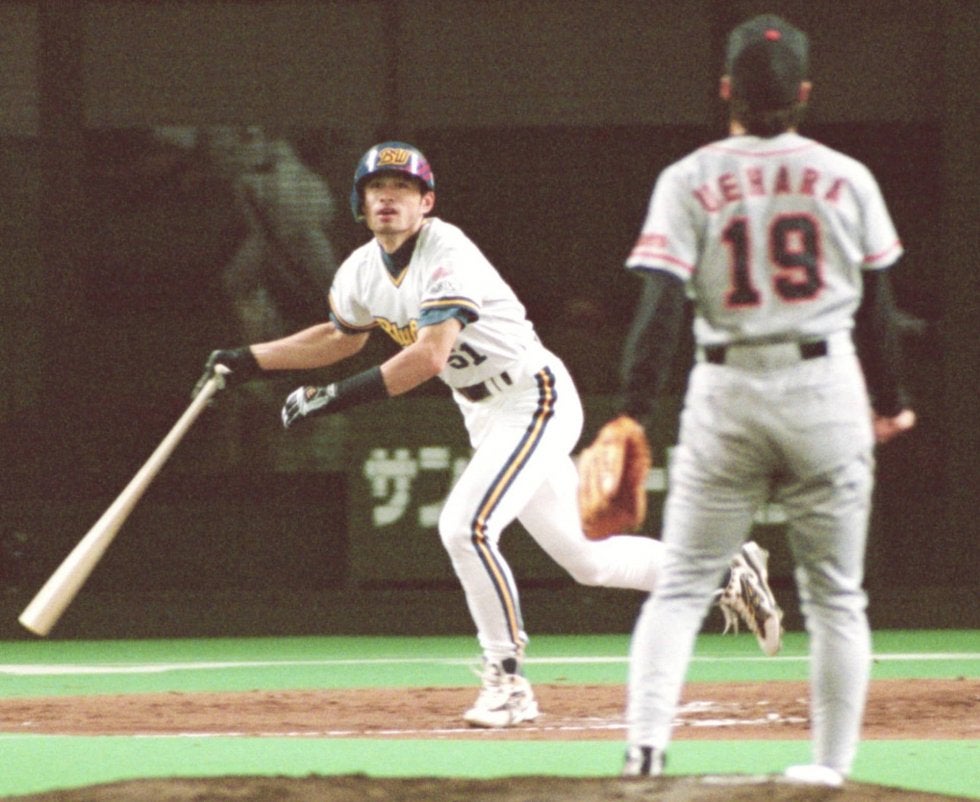 【写真提供=共同通信社】オリックス・イチローが先発の巨人・上原からバックスクリーンに先制本塁打を放つ=西武ドームイチロー…