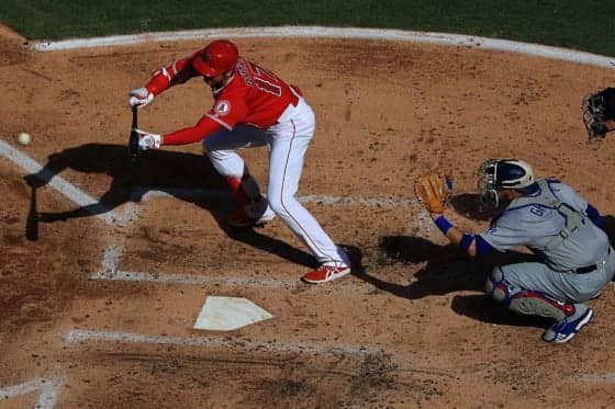 第1打席からセーフィーバントの構えを見せた大谷 エンゼルス大谷翔平投手は7日(日本時間8日)、本拠地ドジャース戦に2試合…