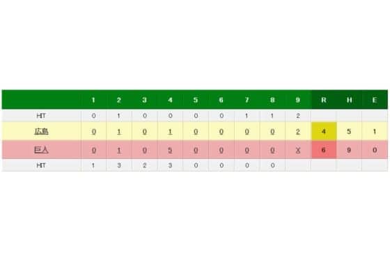 このリードを6回谷岡、7回上原、8回澤村、9回マシソンのリレーで逃げ切りに成功。このカード2勝1敗として今季初めて広島戦の勝ち越しに成功。ヤクルトを抜き、順位も1つ上げた。